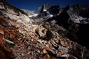 The sun dropped low in the western sky and shadows lengthened as I made my way from Hamilton Lake to Precipice Lake. Eagle Scout Peak stood prominently in the distance. I hoped to climb the peak from Big Arroyo on the next day.